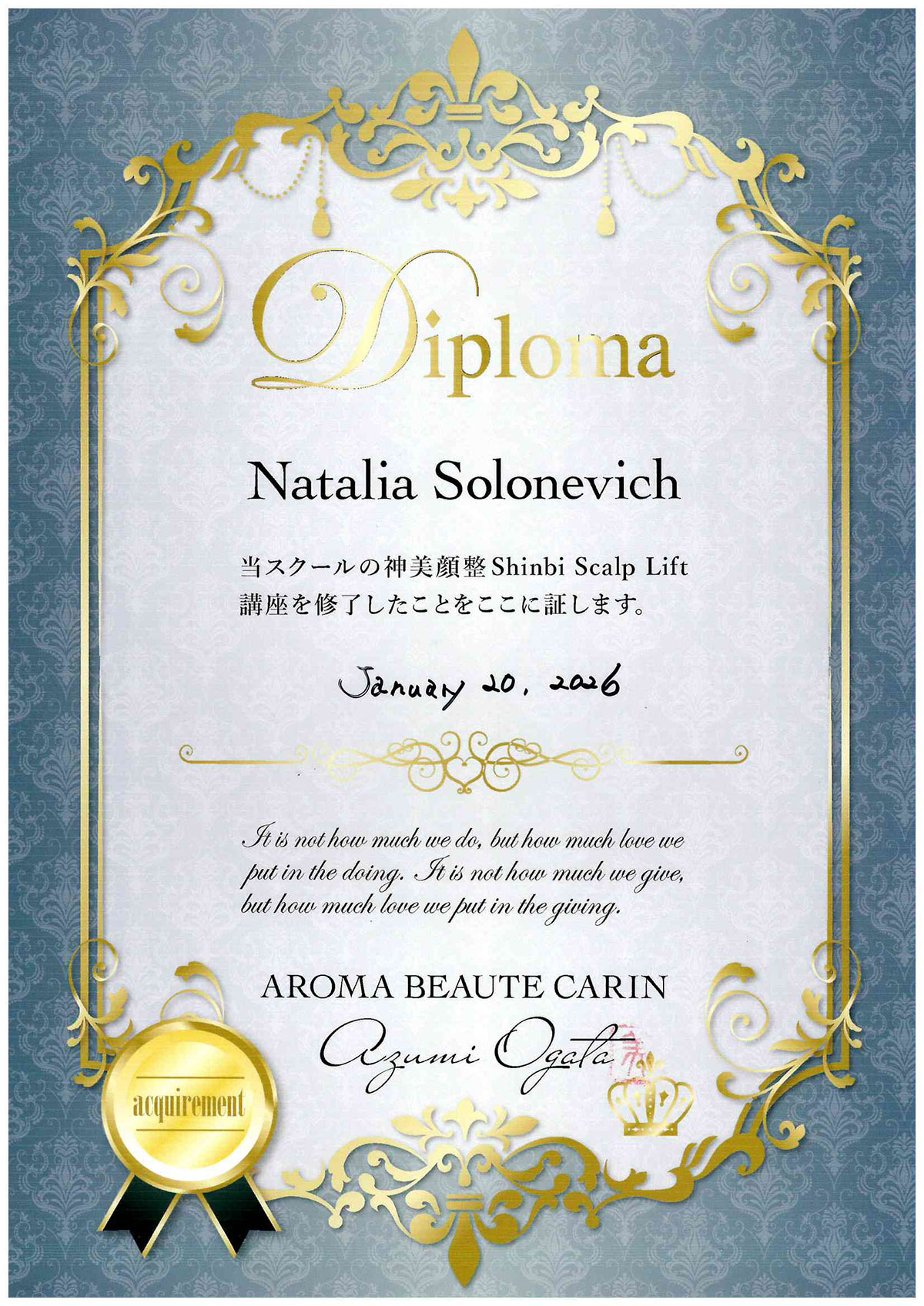 Руководитель и основатель Школы Когао, руководитель и основатель компании Роял Косметикс. Тренер по аутентичной массажной технике Рукако от Канадзава Рукако , Липолифтинг груди от Фудзикава Эмико, техники Суйнаджюцу и Бидзен.
